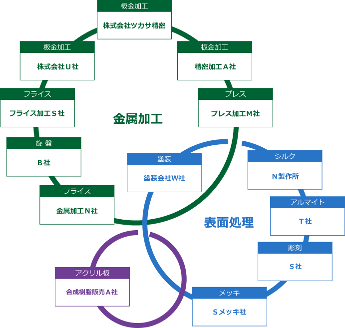 お客様の様々なご要望に応えるため、塗装、修理、材料メーカーなどとの「ものづくりネットワーク」を構築しています。